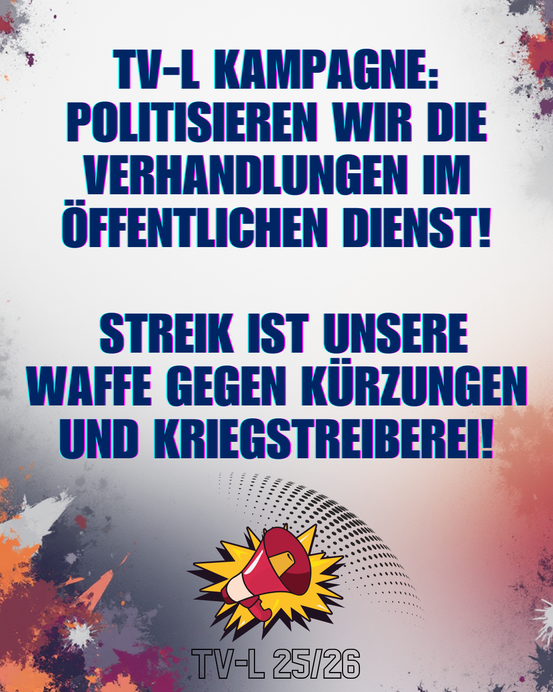 Das kann keine Perspektive für uns sein und deshalb müssen wir die kommende Tarifrunde und unser Recht auf Streik nutzen, um den Angriffen der Politik und der Kriegstreiberei etwas entgegen zu setzen. Lasst uns die kommenden Warnstreiks nutzen, nicht nur um über Prozente zu streiten, sondern auch Widerstand gegen die grundsätzliche Kürzungs- und Kriegspolitik des deutschen Staates aufzubauen! Wir dürfen dabei nicht an den ritualisierten Aktionen hängen bleiben, sondern müssen auf vielfältige Weise Druck aufbauen – sei es durch die Ausübung des Streikrechts durch angelehnte Beschäftigte, kreative Widerstand von Studierenden und studentisch Beschäftigte oder das konsequente Ausnutzen des deutschen Streikrechts in all seinen Facetten bis hin zu weiterführenden Aktionen wie unbefristeten und politischen Streiks.
