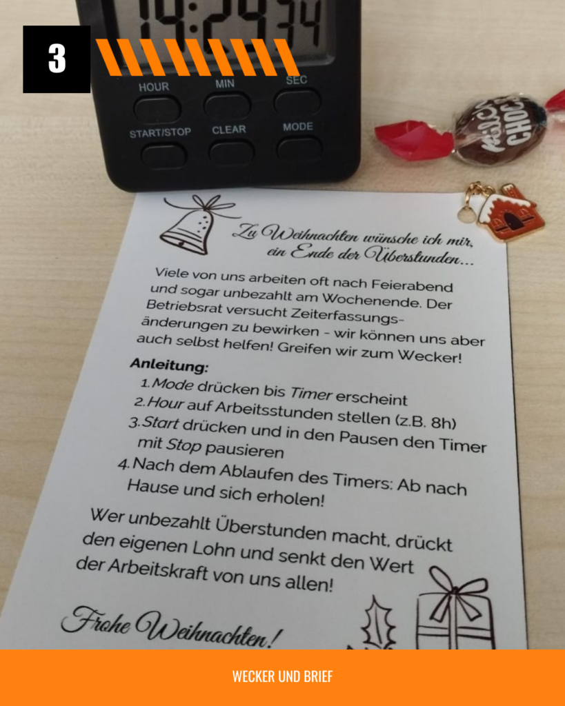Keine Pausen, Scheißchef und ständig diese Überstunden. Unsere Kollegin hat zumindest den Überstunden jetzt ein Ende gesetzt. Alle Kolleg:innen erhielten einen Wecker als Weihnachtsgeschenk.